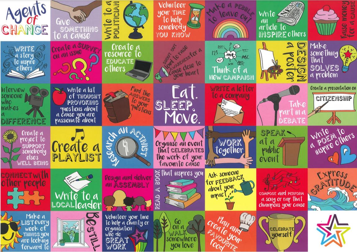 At Birchanger Primary School we are all Agents of Change! Aligned with our school value of ‘Believing’ we encourage the children to be ‘Agents of Change’ – in themselves, in our school, in our community and around the planet. Agents of Change comprises of 40 challenges that develop critical thinking skills and inspire the courageous advocacy of our children. It cultivates the voice, skills, and passion of children, and the impact they can have as global citizens. A number of the challenges help children to focus on the importance of their own well-being, physical and mental health. Other challenges are then designed to help children lead and participate in projects that give something back to others. Children complete the projects by themselves, with friends or with family; and we also complete some of the challenges as a whole school and as individual classes.